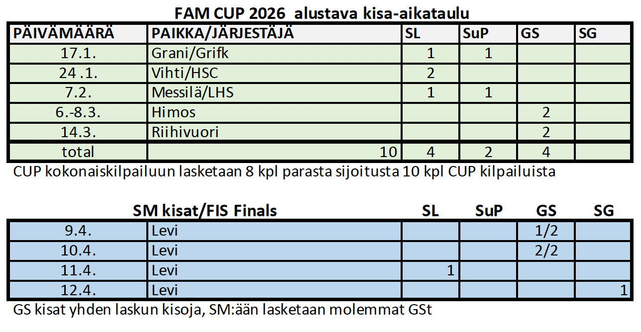 HUOM!! SM kilpailut 2026 järjestetään FIS kilpailujen yhteydessä joten kaikilla osallistujilla tulee olla FIS Masters lisenssi ja FIS Koodin!